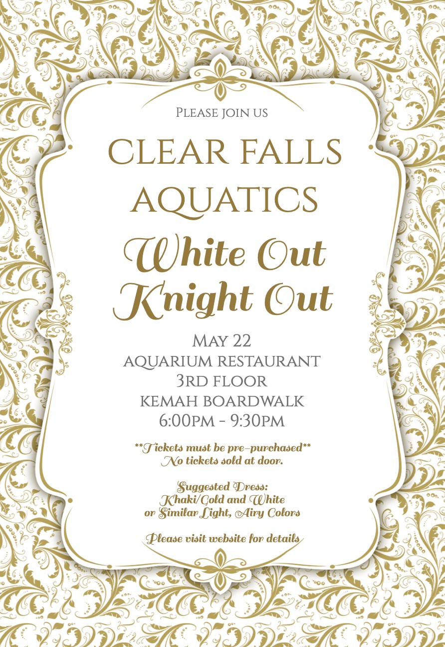 The Clear Falls Aquatics banquet will be held May 22 at the Aquarium Restaurant in Kemah beginning promptly at 6pm.  All Clear Falls athletes tickets will be provided by the booster club. All guests, including dates and family members, must have pre-purchased tickets.  NO TICKETS WILL BE SOLD AT THE DOOR.  Booster club members will be $30 each, non-members $35. Athletes MUST RSVP to Coach Halford.  All guest tickets must be purchased by Friday May 17th.  Below are the details for purchasing tickets.